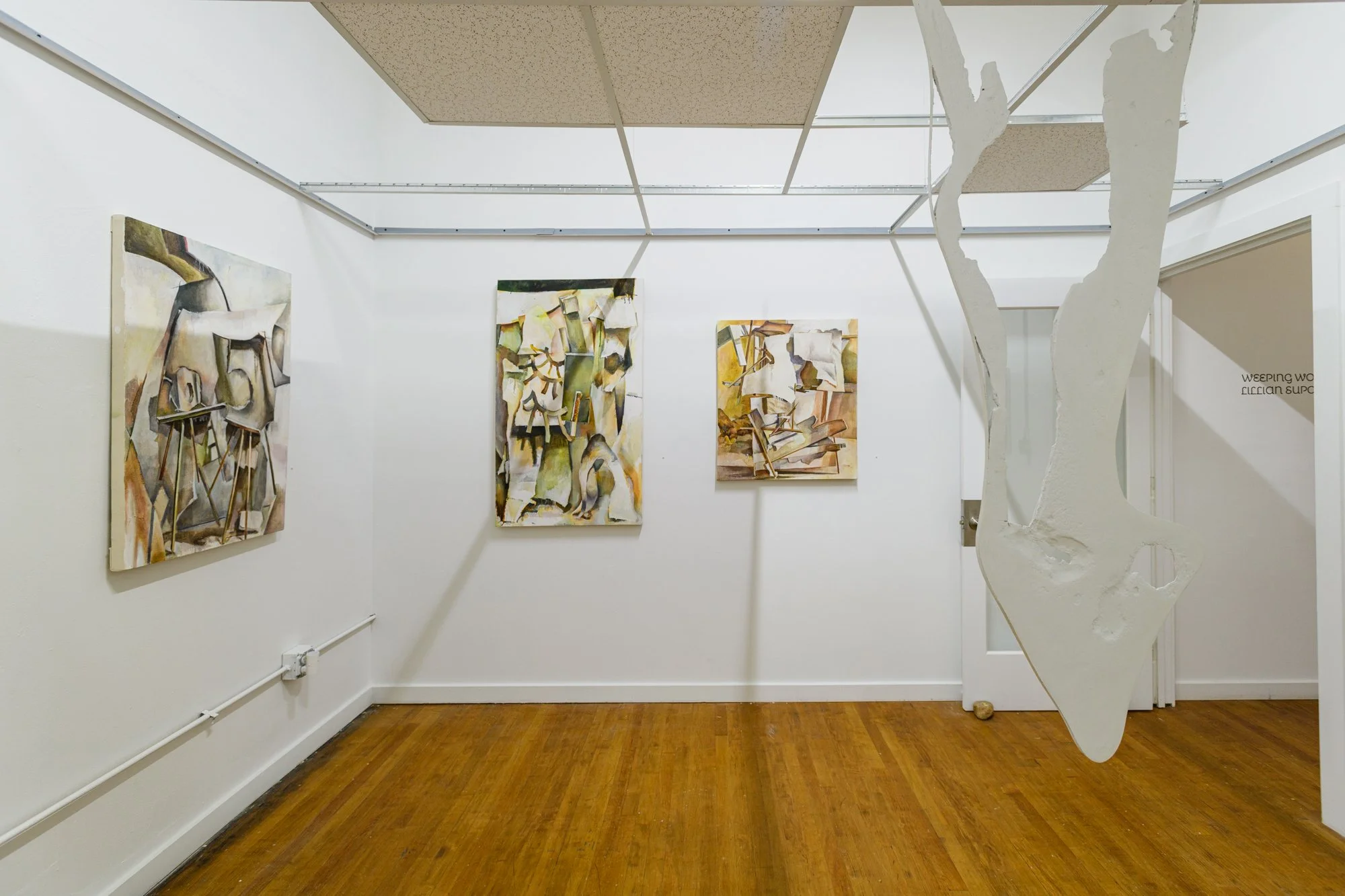The title, Weeping Women, is lifted from the Modernist trope of broken-down, fractured and failing women but offers a contemporary, queer reading of this embodiment. The painted figures, denied a stable self, have no unified inner essence to reveal. Through painterly executions she returns to ideas of subject formation from a queer and psychoanalytic lens guided by the work of Julia Kristeva and Lee Edelman.
